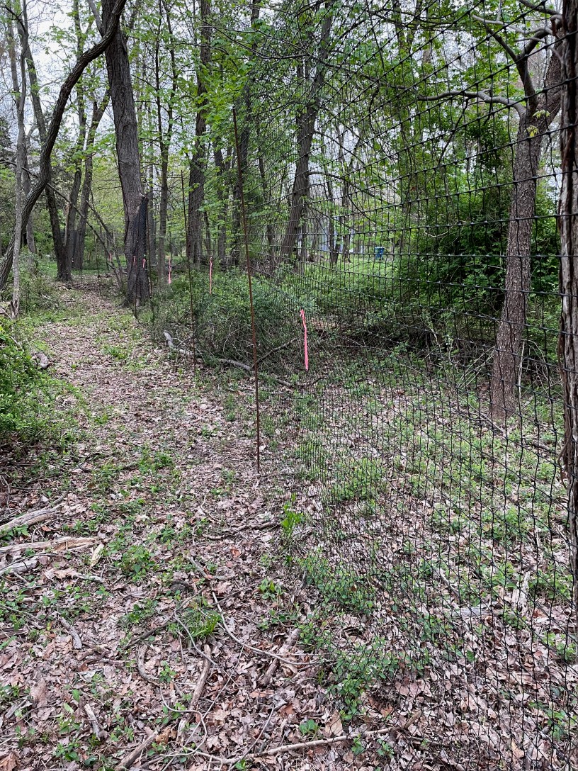 I understand from my research about the netting that it’s important to mark it visually when you first put it up, so the deer don’t crash through it. They don’t know it’s there, so they can’t recognize it. After 4-6 weeks the herds will be trained that there’s a barrier and I’ll remove the orange ribbons you can in the picture at that point.